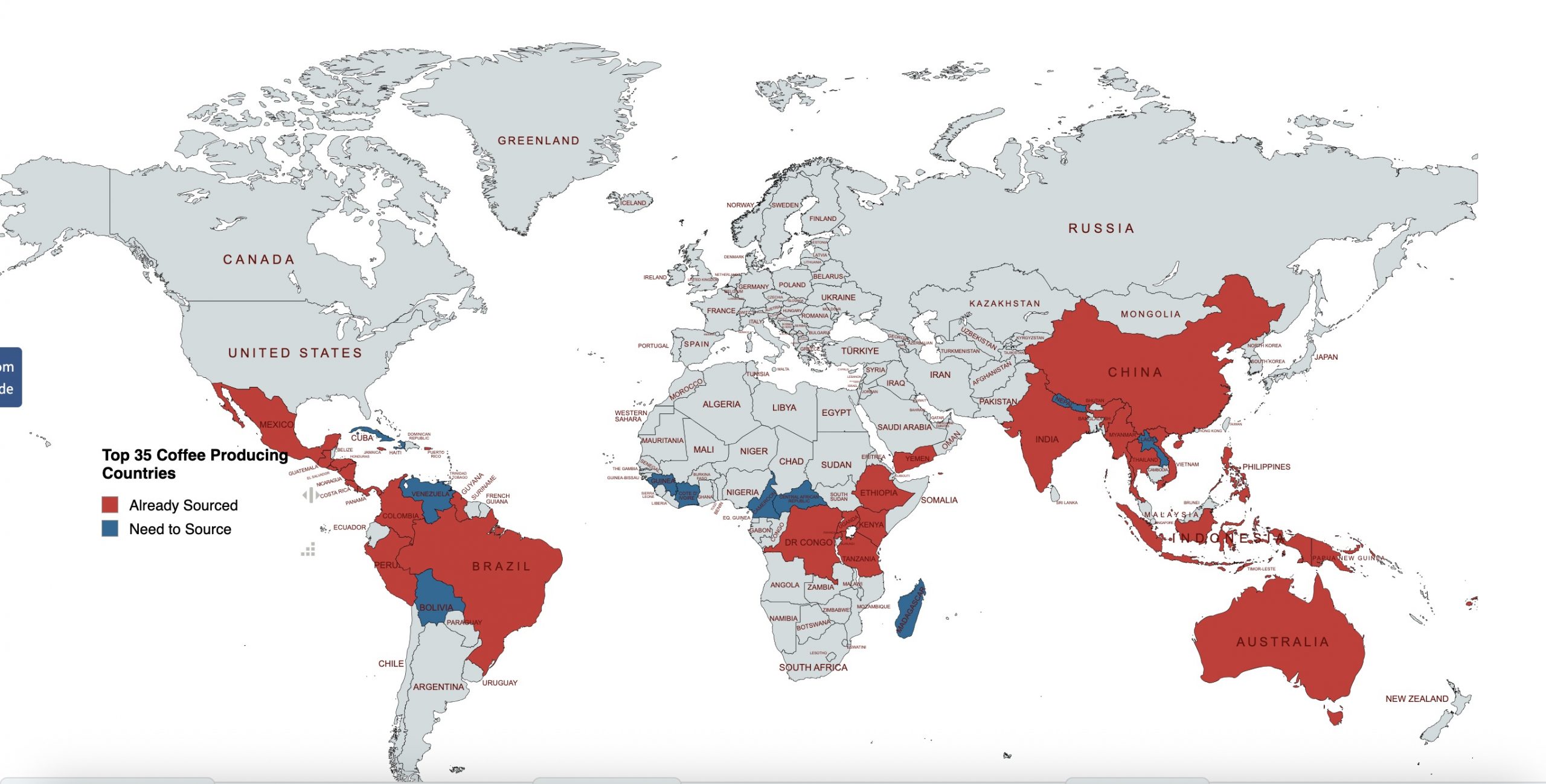 The top coffee-producing countries in the world. Who knew Nepal produces coffee? The red ones are the countries from where I have already sourced coffee beans (34 of them). The blue ones are still to go.