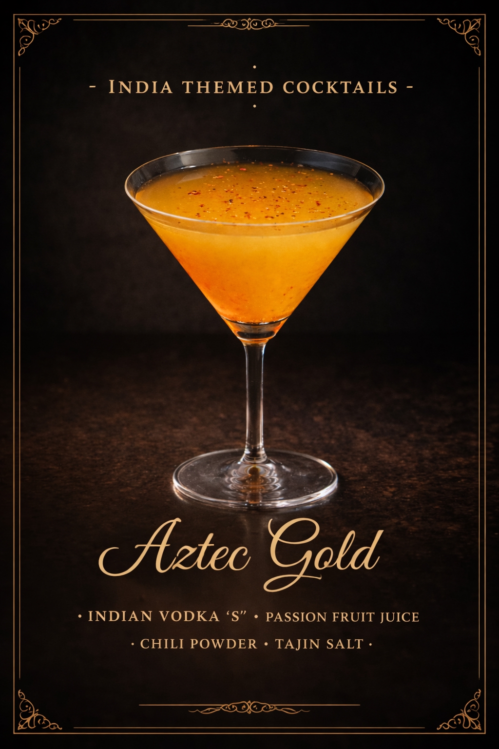 I used Sharmila’s Indian dry chili powder, Tajin salt, “S” vodka from Punjab, and passion fruit juice to create the drink.