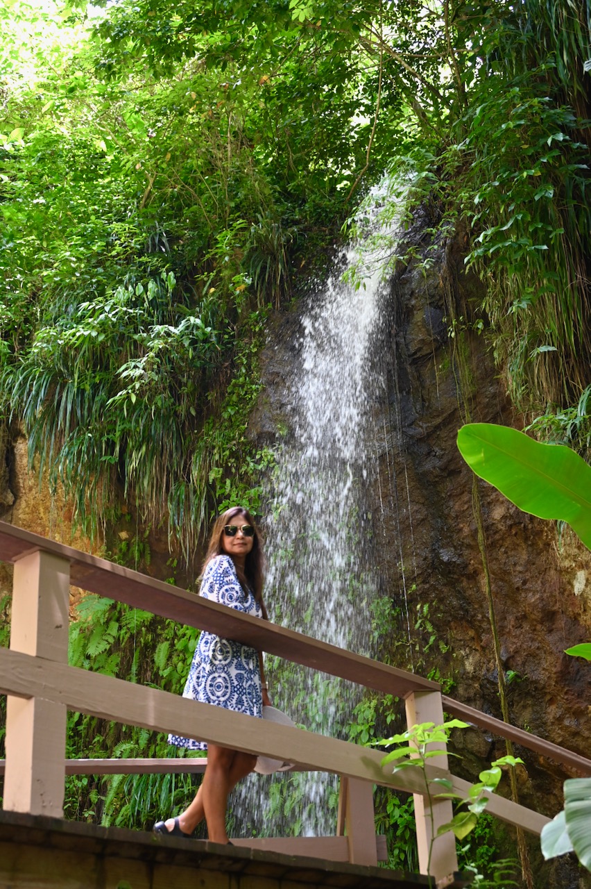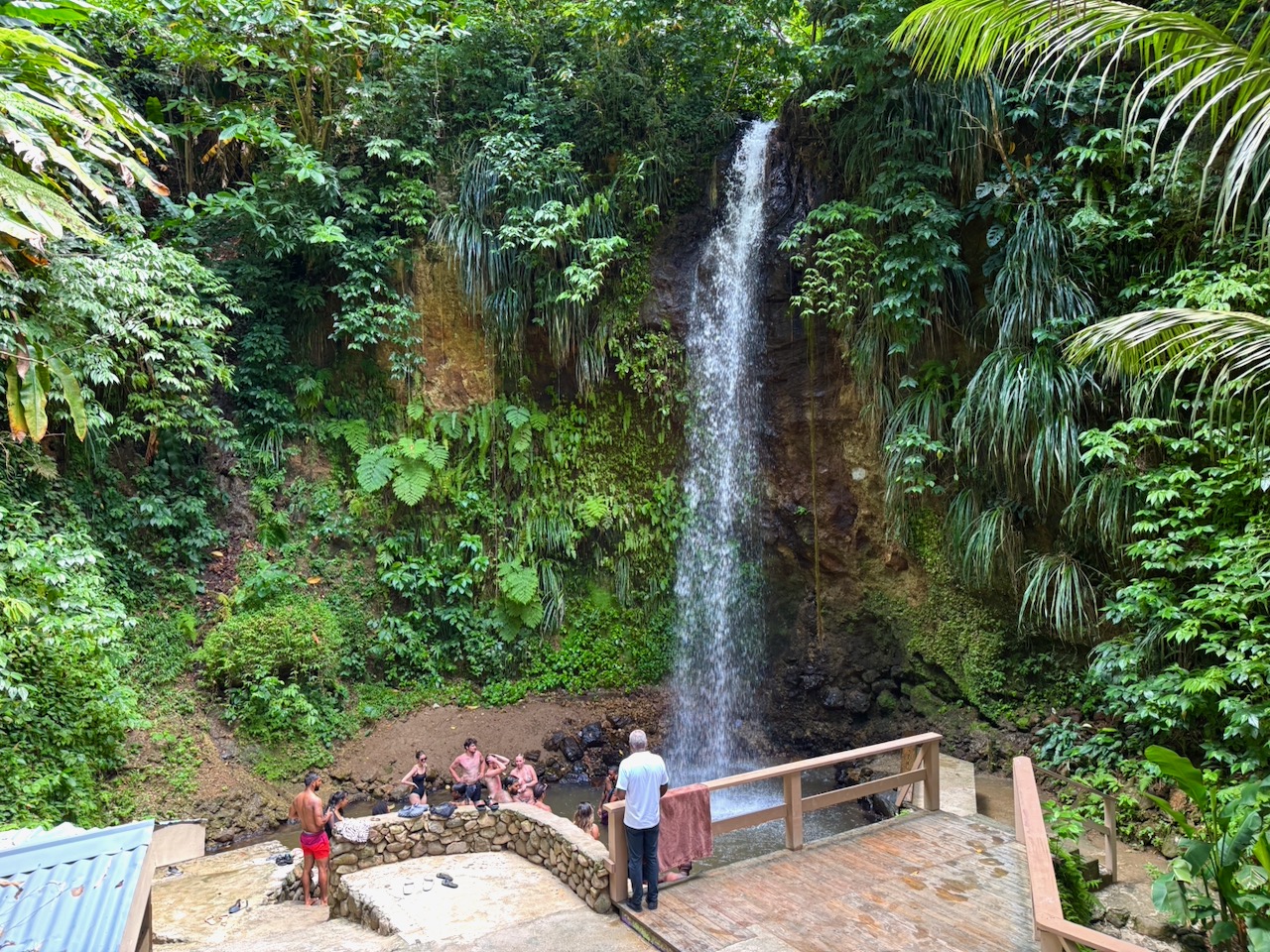 Against the backdrop of Toraille waterfall
